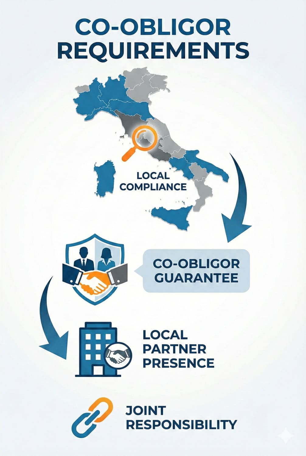 Italian regulations and insurance practice require that, for insurance-based guarantees, there is an Italian co-obligor (also called co-guarantor).